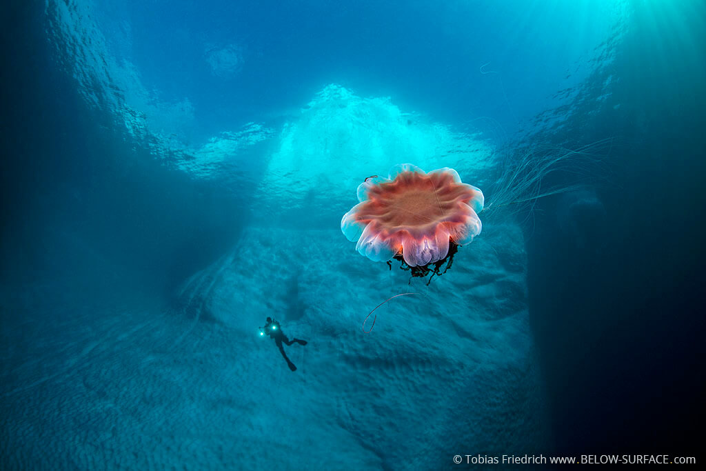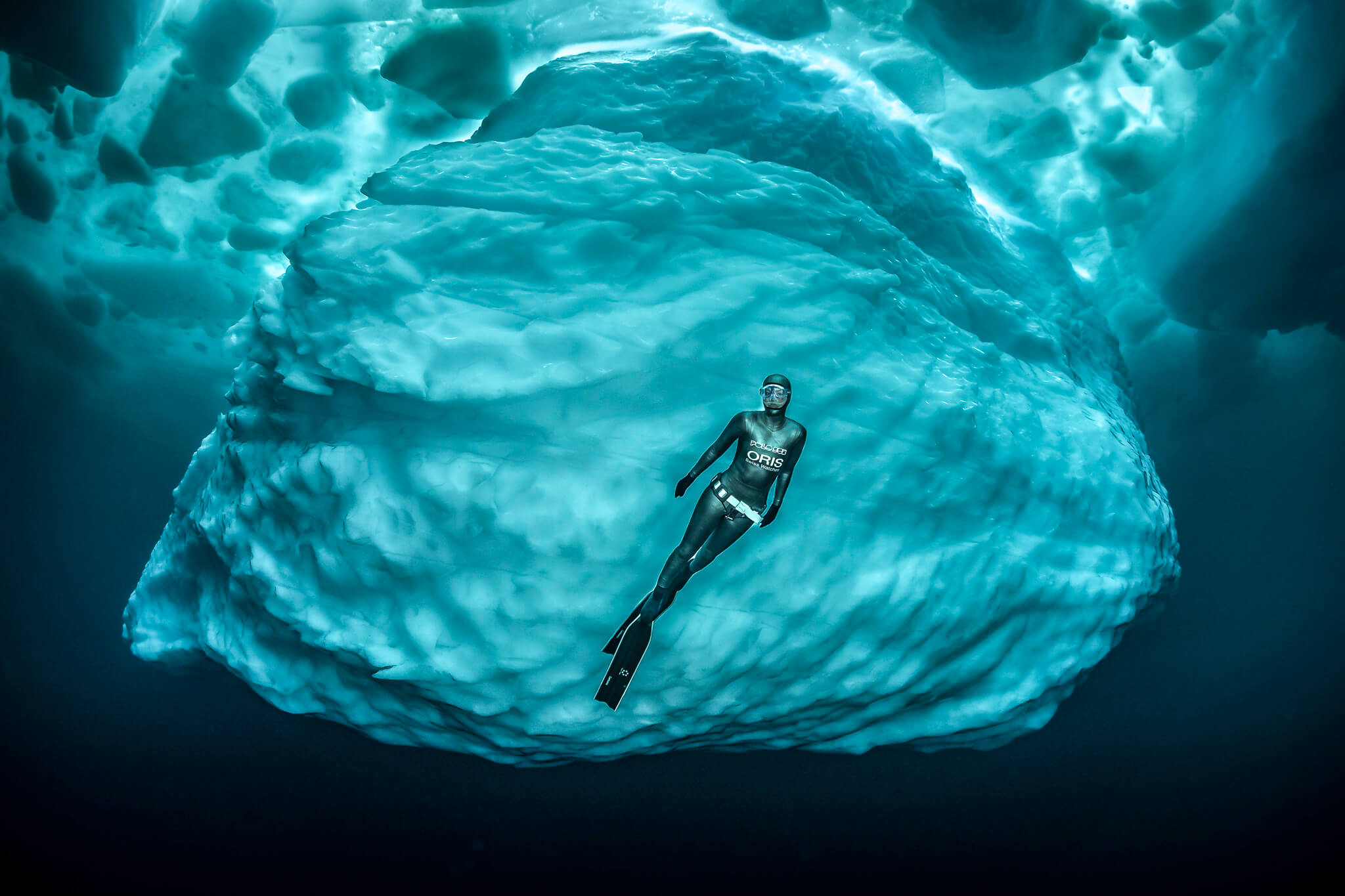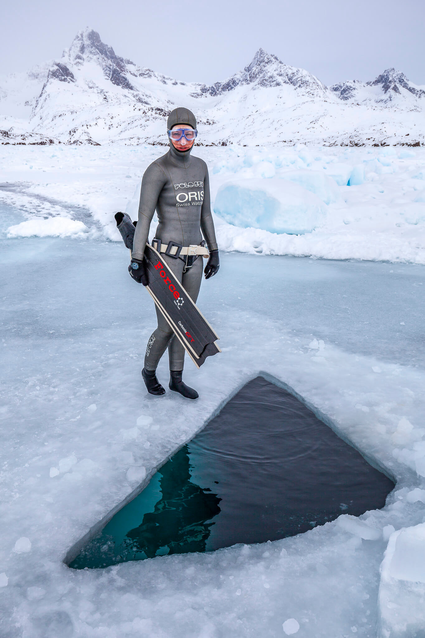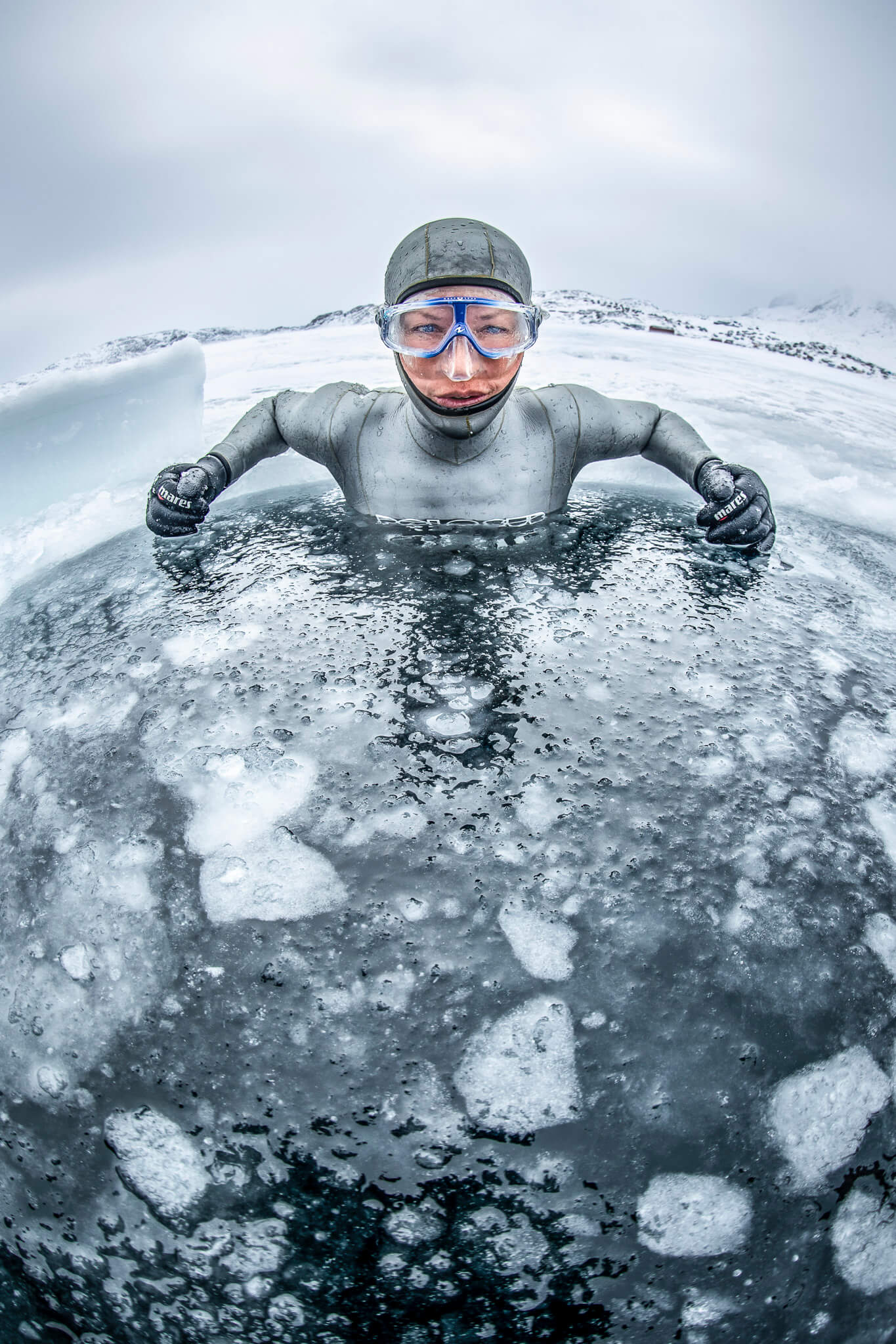 All images have been taken near Tasiilaq in East-Greenland. Water temperature was minus two degree Celsius in topwater conditions up to minus 27 degree Celsius (with wind chill factor). The freediver in the latest images is the over 30-time record holder Anna von Boetticher.